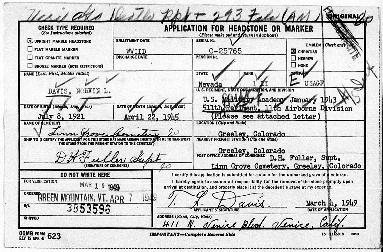1. APO Change of Address - Cpl William R. Walter, D Co 2. 11th Airborne Division TOE list - Lt. William "Buzz" Miley, Jr. |