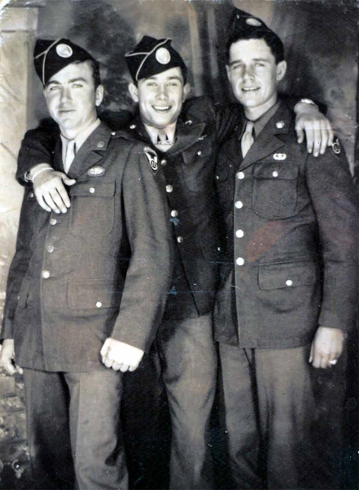 Photo at right: Pfc. James Kennedy, Pfc. Joseph "Joe" Miller and Pfc. Elmer Hudson with new Jump Wings. Taken at Camp Polk, LA. Photo courtesy of Jane Carrico.