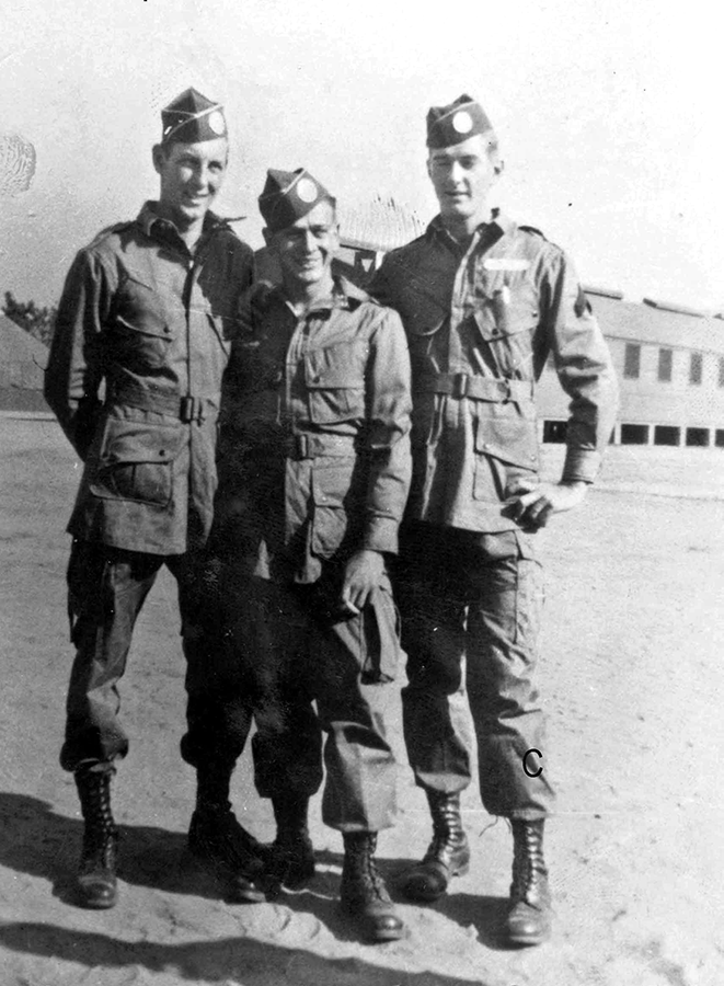 Photo at Right: L to R: "Kurt", Pfc. Joseph W. Vernon, Cpl. William R. Walter. Taken at Camp Mackall. Photo by William R. Walter.