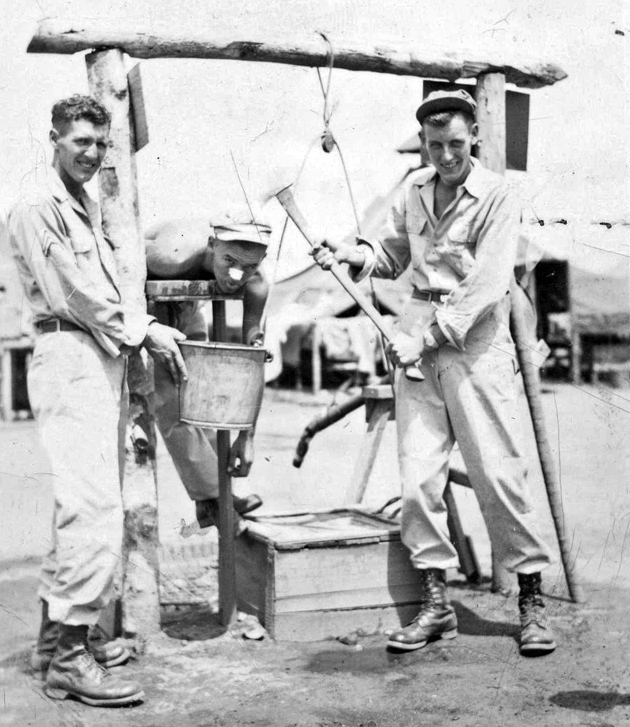 Photo at Right: L to R: Sgt. Robert F. Ingram, Sgt. James Stott, Cpl. William R. Walter. Photo by William Walter, taken at Dobodura, New Guinea