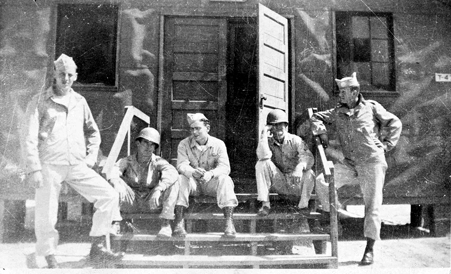 ![]() L to R: Cpl. William R. Walter, Thompson, Pvt. Bart A. Howey, Sgt. Robert F. Ingram, Pfc. Richard A. Goff at Camp Mackall (Photo by Willam Walter) |