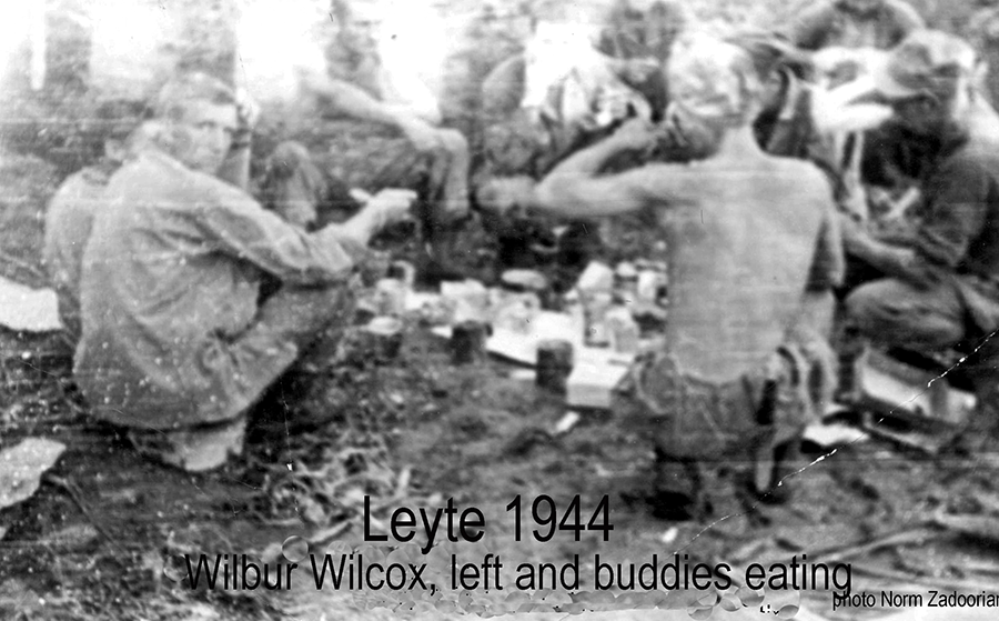 Wilbur Wilcox, seated on left, eating K-Rations with squadmates on Leyte (photo by Red Zadoorian, courtesy of Jane Carrico)