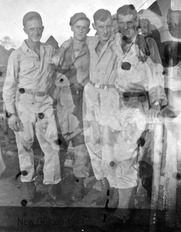 Photo at right: L-to-R: Pvt. C.J. Ross, Pfc. D.J. Hyatt, Cpl. William R. Walter, "Jim"; the Pinochle Players on New Guinea, 1944