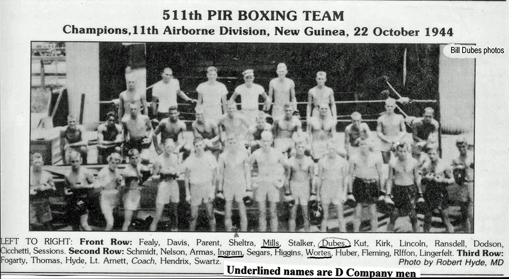 I recall getting a furlough home – probably in February - and hunting pheasants in the snow. Shortly after, we rode the train to Camp Stoneman (in November 1944) for debarkation to the Pacific. The most memorable development in our short stay at Stoneman was when all of Company D was put on KP in the huge mess hall and Bittorie clogged up the “China Clipper” in the kitchen and the hot steam kept about 500 hungry men from getting their grub on time. The trip from San Francisco Bay to Oro Bay, New Guinea took the better part of a month, due to constant changing of the ship’s course. This was considered necessary because we had no escort to protect us from submarines. I never would have made a good sailor, as I was queasy most of the trip. This area was to be our training and staging area for the Philippines campaigns, and our first taste of tropical climate. We were told to ditch the perimeter of the pyramidal tents to keep from flooding. Most of us dug a ditch about a foot wide and the same dept, and when the rains hit we were completely inundated. We stayed here several months before heading to Leyte. We had a couple of practice jumps and simulated problems, but still had time for some recreation. I was on the Regimental boxing team, and eventually got my nose rearranged for my efforts.