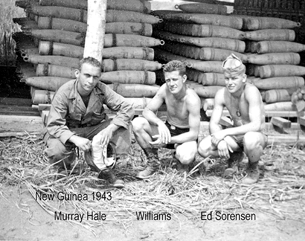 Weekends were generally free so a few of us, Red Zadorian, Chick Williams, Murray Hale, myself and others I can’t recall, would scrounge some food and head for a favorite spot we had found at, or near Buna. There was a small shack on the edge of the beach that had sides, a roof, but an open front facing the beach. One particular morning Chick and I woke up first and he decided to go for a swim. I sat on the floor watching him when I saw shark fins in the water near him; he began shouting and scrambling for the shore. His cries awakened everyone by the time Chick was safely out of the water. He had been bumped by at least one shark but suffered no harm. Again all hell broke loose as we began firing at the fins darting about. Finally someone hit a fin and as the blood began to taint the water, the wounded shark was attacked by his mates. None of us ventured out to see if there were any remains.
