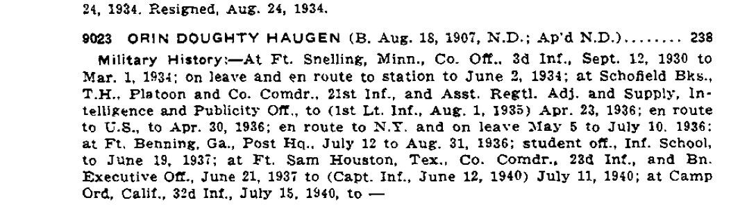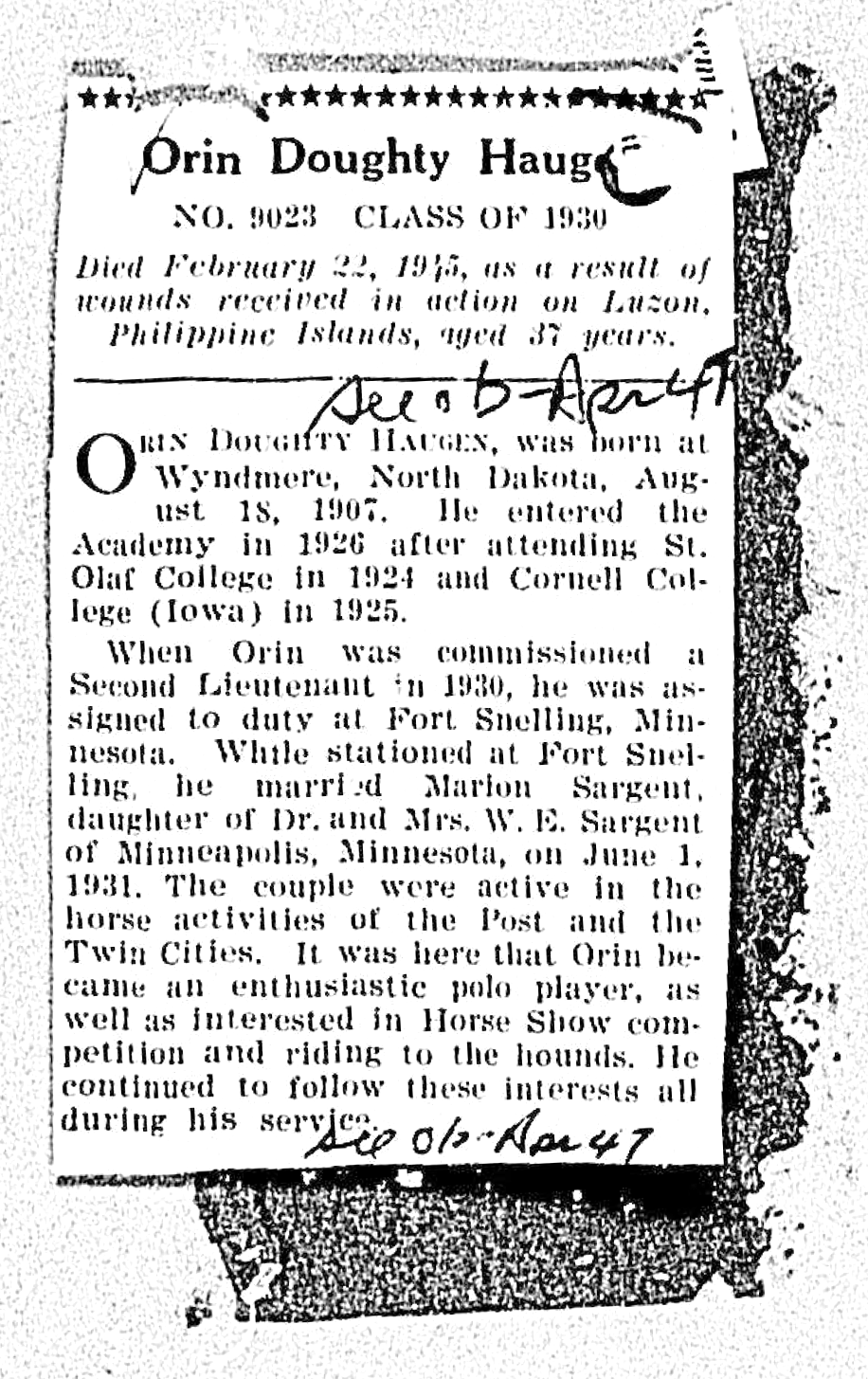 Orin D. Haugen was born Aug. 18, 1907, Wyndemere, N.D. to George O. and Georgie Doughty Haugen. He attended St. Olaf College, then Cornell College in 1925. In 1930, Orin was commissioned 2nd Lt., U.S. Military Academy at West Point, then assigned to Fort Snelling, MI. June 1, 1931, married Marion Sergeant, daughter of Dr. and Mrs. W. E. Sergeant, Minneapolis, MN (the Sergeant's spent earlier years in Gettysburg, S.D.). They had one son, William, or "Billy", whom the 511th PIR paratroopers took to calling "Pebble" since his father was "The Rock." The Haugen's were are active in the horse shows at Twin Cities and Orin became a good polo player, and enthusiastically rode to the hounds on fox hunts. He continued to follow these interests all during his service.